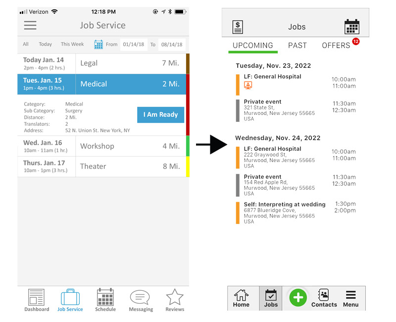 Here's where the ideation began. What if we could create something bigger than a scheduling solution? What if translators could manages all their jobs for multiple organizations in one place? What if the app could sync with their own personal calendar and prevent scheduling conflicts?