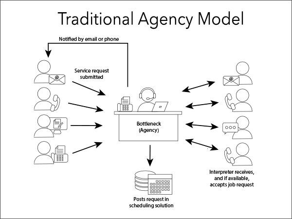 Agencies have a major bottleneck. When a translation request comes to an agency, they call an interpreter to see if they are available. It may take a few hours for the interpreter to respond or they might not respond at all. The agency then calls another interpreter who also doesn't answer their phone. The service request goes unfilled.